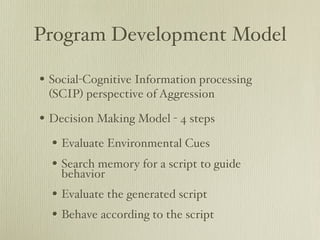 The document discusses the prevalence and manifestations of depression in children and adolescents, noting that depressive symptoms can differ from those in adults, with irritability and social withdrawal being common signs. It emphasizes the importance of recognizing childhood depression, often linked to previous abuse or neglect, and highlights the serious issue of suicide among adolescents. Intervention strategies for addressing aggression and behavioral issues in this population are also outlined, along with available psychological services.
