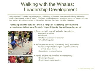 The document describes a 5-day leadership development program called "Walking with the Whales" held in the De Hoop Nature Reserve in South Africa. The program uses hiking along the Whale Trail and exposure to the natural environment to help participants reconnect with themselves, refine their leadership skills, and reflect on their lives and roles through facilitated discussions and case studies. It accommodates 10 people and includes guided hikes between coastal cottages, leadership coaching and development sessions, and gourmet catering.