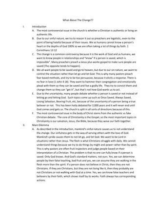 The document discusses the controversial issue of determining whether a Christian is truly authentic or living an authentic life. It notes that due to humanity's sinful nature, we try to control situations and judge others rather than letting God do His work. The change that God brings is difficult for humans to understand fully. It argues that salvation is by grace alone through faith in Jesus, and sanctification is a process where God turns believers from sin as they grow in faith and submit to Him. The conclusion emphasizes that change only happens when we let go of trying to control and fix others, and instead let God work through us by His Spirit as we surrender to Him.