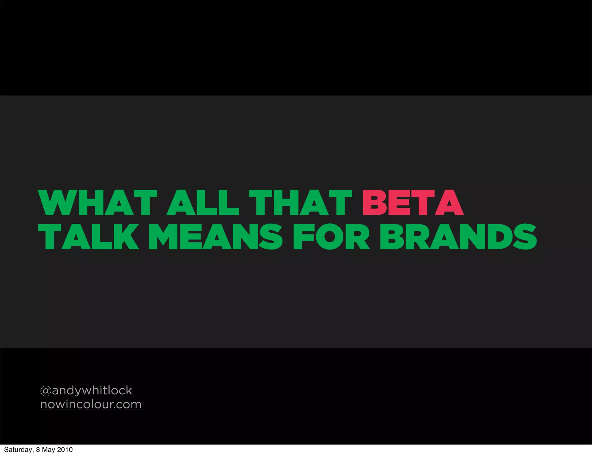 The document discusses the concept of 'beta' in branding, emphasizing that brands need to embrace constant innovation and flexibility in a complex and unpredictable media landscape. It suggests that brands should experiment, learn from mistakes, and create frameworks that allow for audience interaction and adaptation. Overall, it calls for brands to align with audience desires and create strategies that can quickly respond to changing conditions.