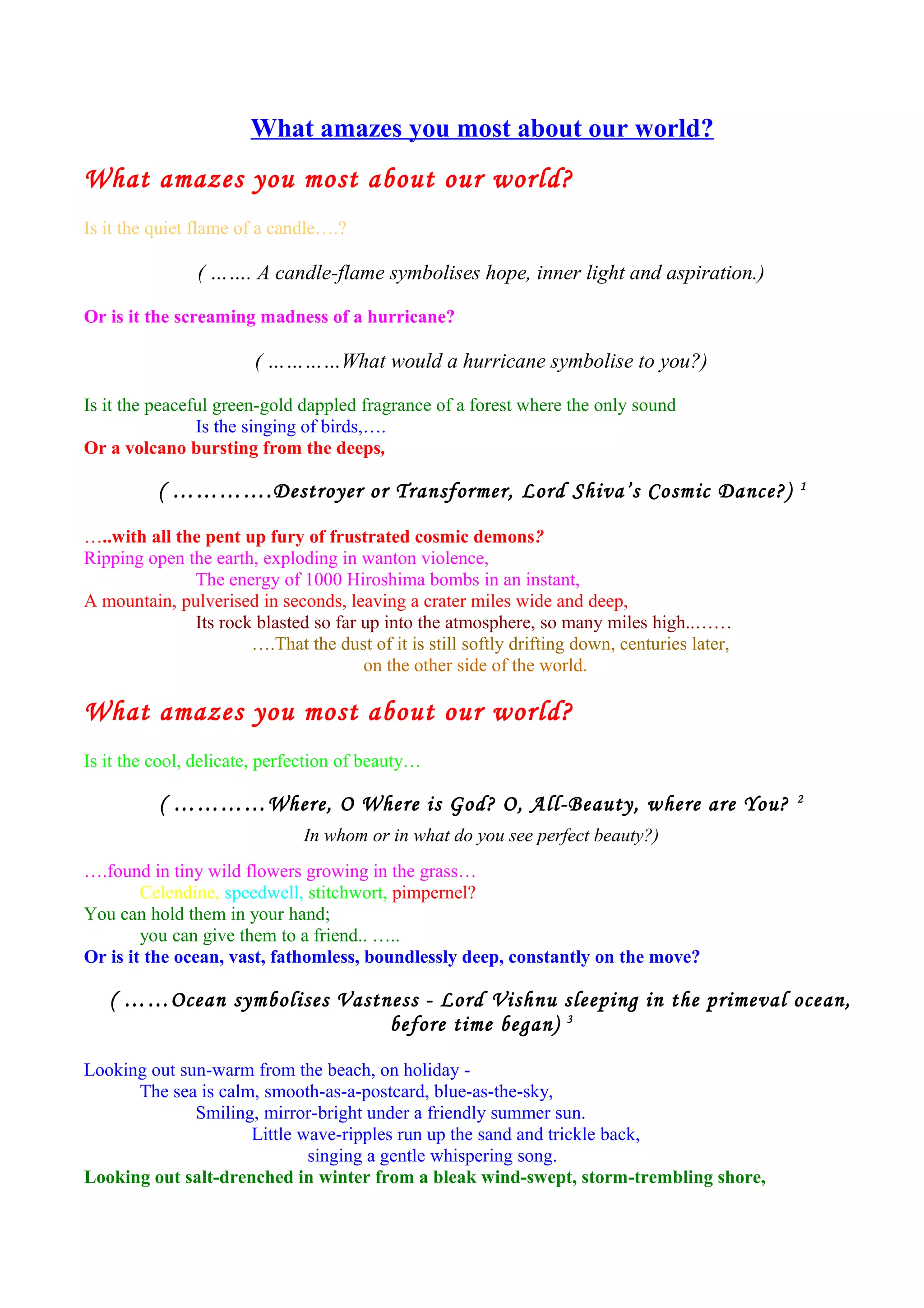 This document explores the many wonders of our world that could amaze us, from natural phenomena like volcanoes, oceans, forests, sunsets and stars to delicate beauty in flowers and snowflakes. It discusses how different things could symbolize concepts like hope, vastness, destruction or transformation. It emphasizes the vulnerability and preciousness of our planet Earth amidst the vastness of space, and encourages loving and protecting this "living jewel".
