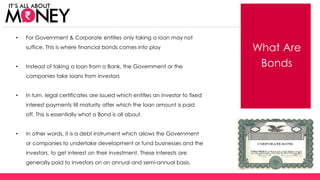 Bonds are debt instruments that allow governments and corporations to borrow money from investors. Instead of taking loans from banks, they issue bonds where investors receive fixed interest payments until maturity, when the full amount is repaid. There are different types of bonds including government bonds, which are backed by the government and have lower risk, and corporate bonds, which are riskier but can offer higher returns. When choosing bonds, investors must consider factors like security, credit rating, risks involving interest rates and inflation.