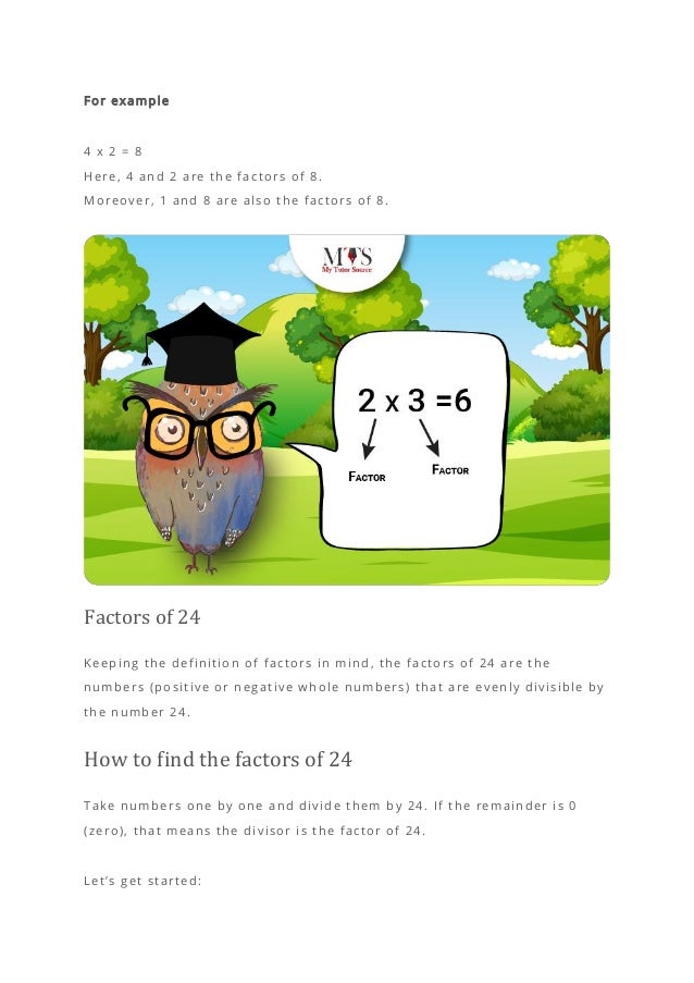 The document explains the factors of 24, defining factors as numbers that divide another number evenly. It details how to find the factors and presents positive and negative factor pairs along with the prime factorization of 24, which is 2 x 2 x 2 x 3. Additionally, it provides examples and quick tips for identifying factors of any number.