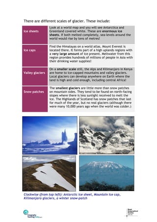 A glacier forms over many years in places where snow falls but does not melt, accumulating in layers that compress into ice. As glaciers move into warmer areas, melting occurs at the glacier's snout or front. Glaciers advance when accumulation exceeds melting and retreat when melting exceeds accumulation. Factors influencing this balance include climate cycles, volcanic eruptions, and human-caused global warming, which is currently causing many glaciers to retreat rapidly.