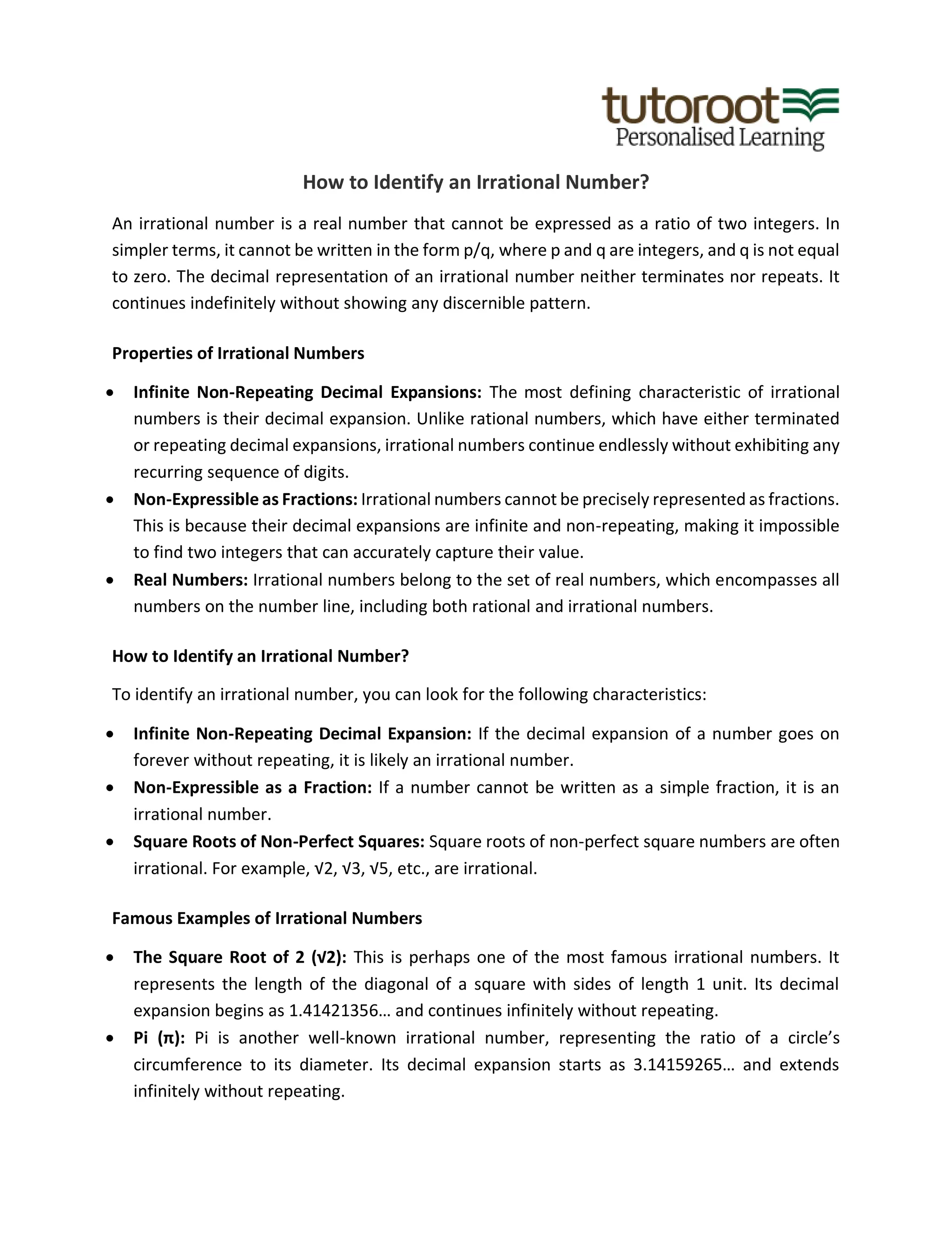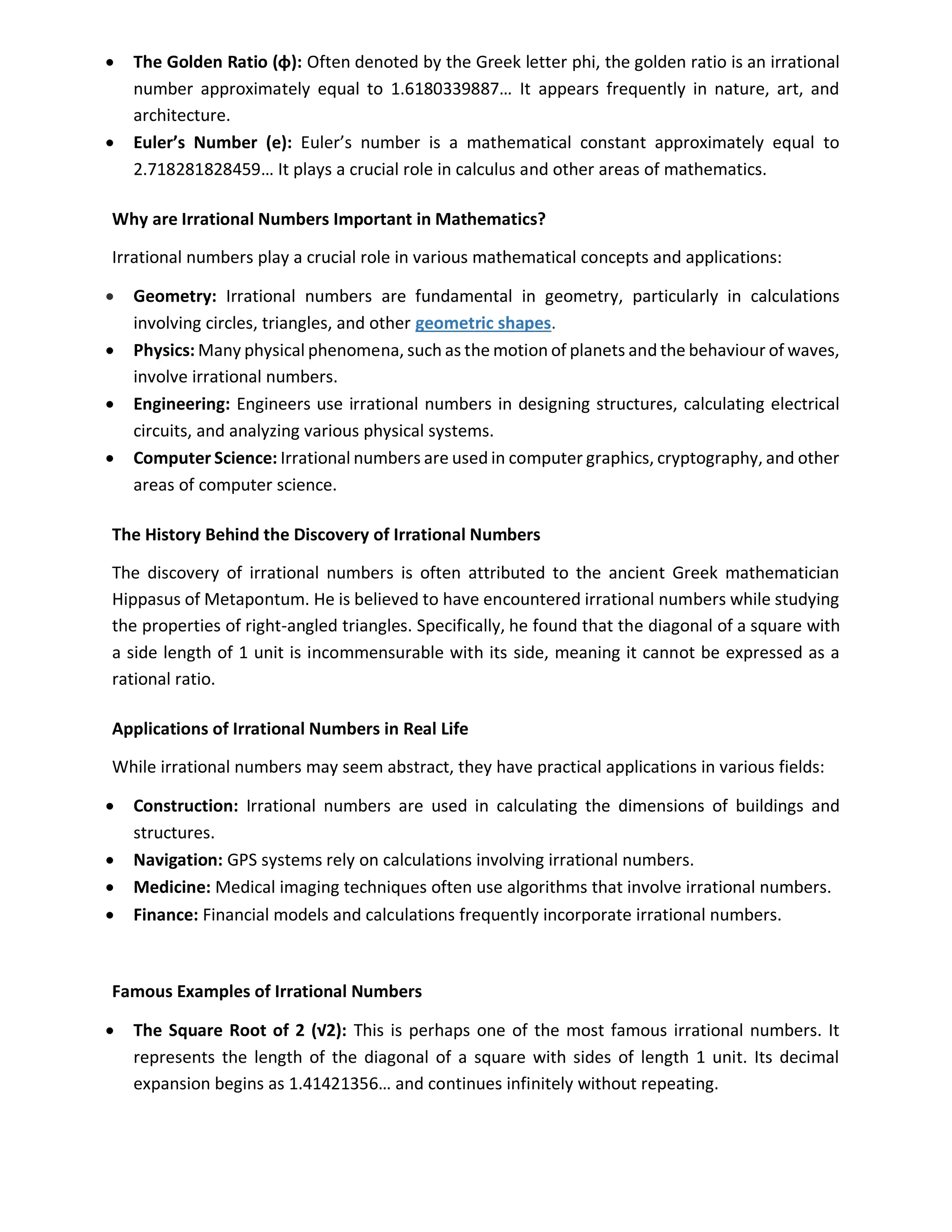 Irrational numbers are real numbers that cannot be expressed as a ratio of two integers, characterized by infinite non-repeating decimal expansions. Notable examples include √2, π, and Euler's number (e), which have significant applications in geometry, physics, and engineering. Their discovery is attributed to Hippasus of Metapontum, and they play a crucial role in understanding various mathematical concepts and real-life applications.