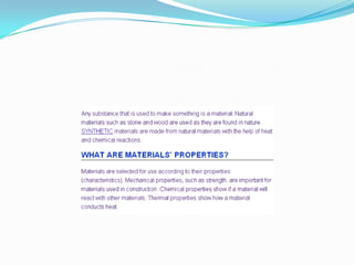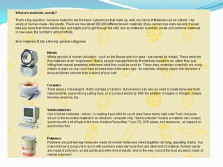 Materials are substances that are used to make objects through various manufacturing processes. Materials can be classified as metals, ceramics, polymers, composites or semiconductors based on their atomic structure and properties. The choice of material depends on the application and factors like strength, hardness, resistance and cost.