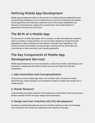 Mobile app development services involve creating software applications specifically for mobile devices, encompassing various processes from idea generation to deployment. Key components include market research, design, coding, testing, and ongoing maintenance, while approaches vary among native, web, and hybrid app development. As technology evolves, trends like IoT integration, AR/VR applications, and AI utilization are shaping the industry's future, delivering enhanced user experiences and driving business growth.