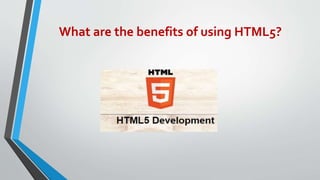 HTML5 is the latest version of HTML that introduced many new features. It allows temporary local data storage, inline use of SVG and MathML, and supports new form controls like dates and URLs. HTML5 also includes audio and video tags, making media embedding easier. Additionally, HTML5 improves accessibility, supports canvas for game development, and results in simpler and faster coding compared to previous HTML versions. Overall, HTML5 is a more powerful yet accessible language for building websites and applications.