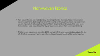 Non-woven fabrics are made by bonding fibers together using chemical, heat, mechanical, or solvent treatments rather than weaving or knitting. There are several manufacturing processes for non-wovens including spun-bond/spun-laid, melt blown, needle punching, and spun-lace. The production process for non-wovens is smaller and less expensive than for woven fabrics, though woven fabrics are generally more durable and strong due to their fabric structure.