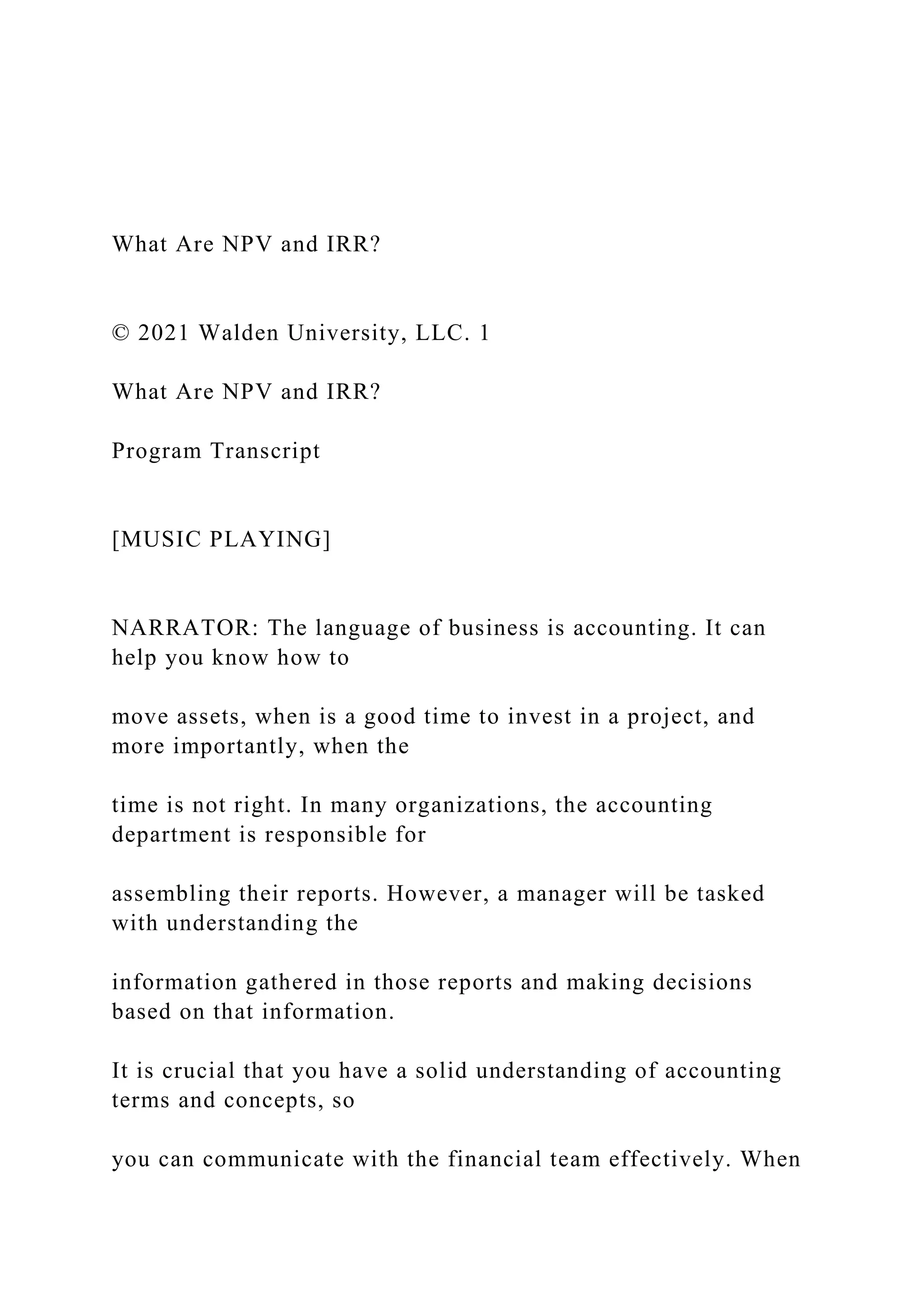 The document explains net present value (NPV) and internal rate of return (IRR) as key financial metrics for evaluating investment profitability. NPV determines the value of an investment in today's terms by calculating the present value of cash inflows and outflows, while IRR identifies the discount rate that makes the NPV zero. Both metrics are essential for managers to make informed investment decisions, with positive NPVs indicating acceptable investments.