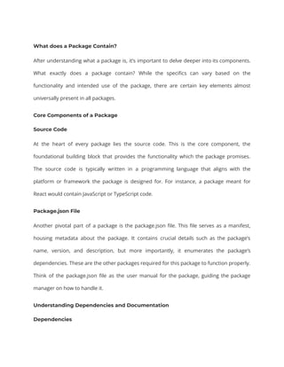 Package managers are tools that assist software developers in sharing, utilizing libraries, and managing dependencies efficiently through command line interfaces. A package consists of source code, a package.json file that includes metadata and dependencies, and documentation, helping developers integrate functionalities into their projects. Different package managers exist for various programming languages, with popular options for JavaScript projects including npm and Yarn, which enhance code reusability, collaboration, and dependency management.
