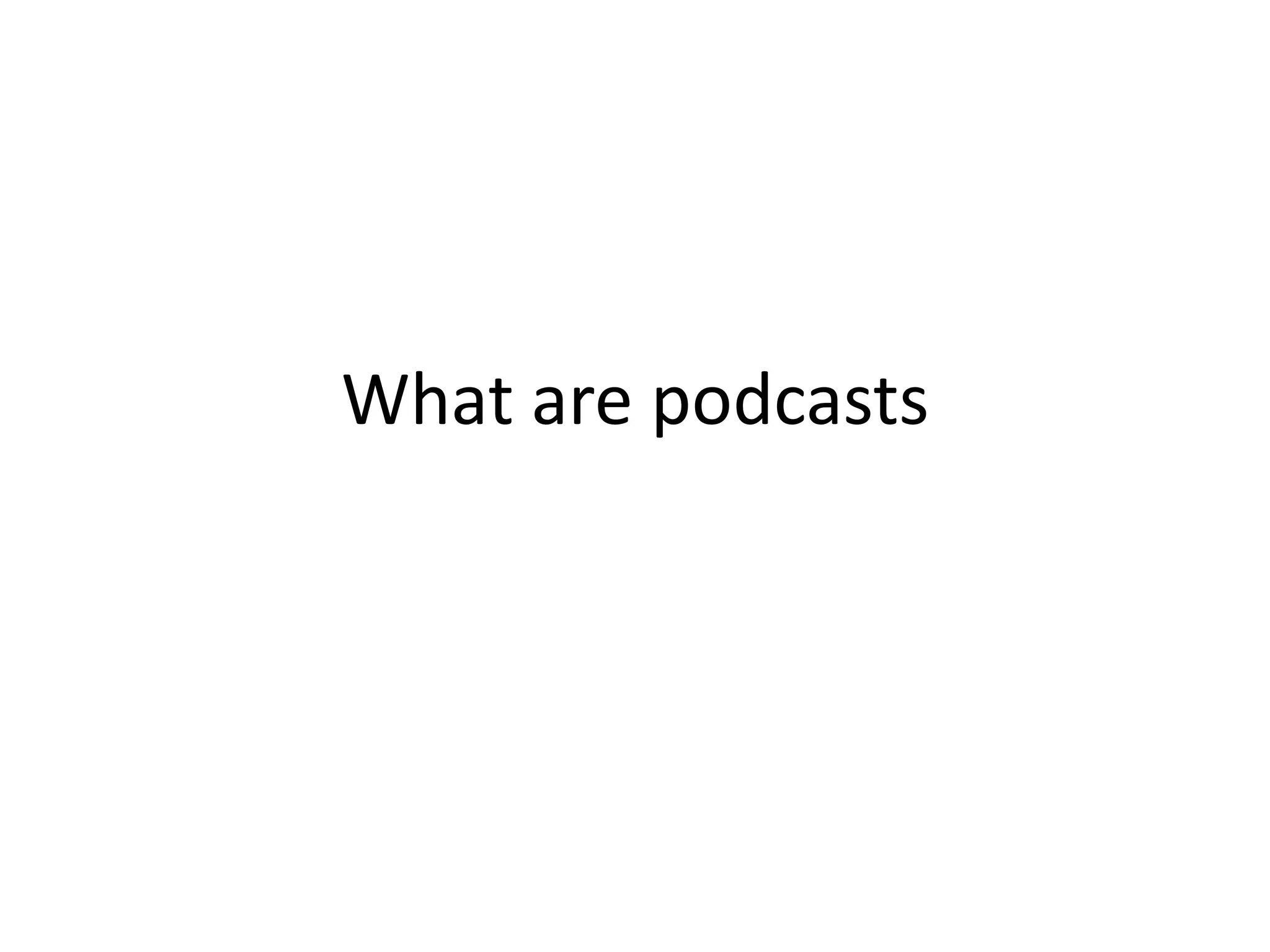 Podcasts are digital audio or video files that are released episodically and downloaded through web syndication. They can be listened to on computers or mobile devices using podcasting software. Podcasts are used by news companies, sports organizations, celebrities, governments, and more to distribute recurring content on various topics. Creating a podcast involves recording audio, editing it, generating an RSS feed, and hosting the files online to build an audience.