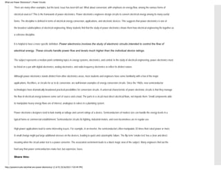 Power electronics involves the study of electronic circuits intended to control the flow of electrical energy between sources and loads. These circuits handle power levels much higher than individual device ratings through the use of semiconductors. Power electronics engineers design circuits to efficiently convert electrical energy among different forms, such as converting AC to DC. While familiar applications include rectifiers, new semiconductor technologies have broadened conversion possibilities.