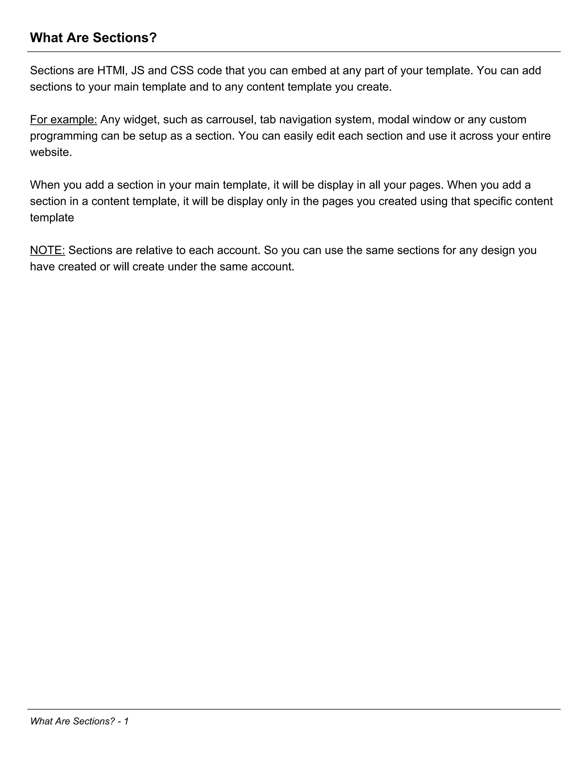 Sections are reusable pieces of HTML, JS, and CSS code that can be embedded within templates. Common examples of sections include widgets like carousels, tabs, and modals. Sections make it possible to easily edit and reuse code across an entire website. Sections are created, edited, and deleted from the Section Gallery or My Sections area when working in the template editor.
