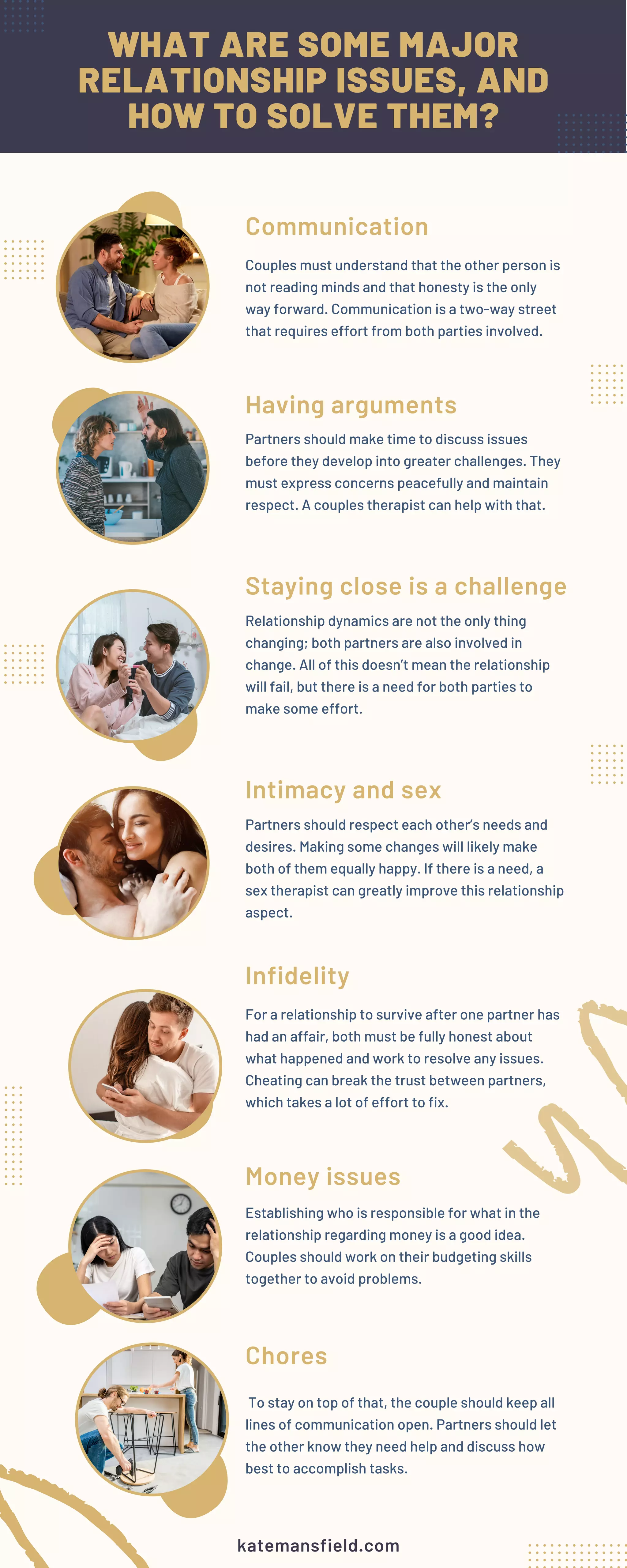 Major relationship issues include intimacy, infidelity, money management, and shared responsibilities. Effective communication and honesty are crucial for resolving conflicts, with options like therapy available to aid couples. Both partners need to actively participate and make efforts to maintain a healthy relationship.