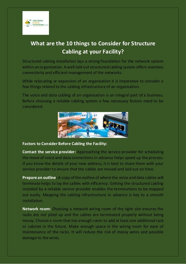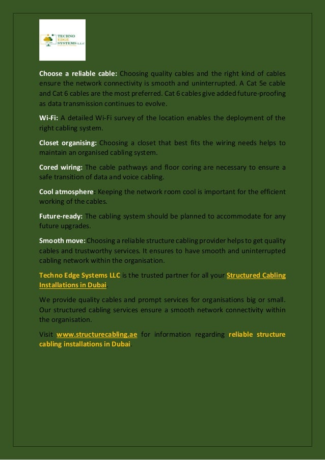 Structured cabling installation lays a strong foundation for the network system within an organization. We have to follow step by step process for structure cabling installation. Techno Edge Systems LLC is the best provider of structure cabling Installation Dubai. For any queries Contact us: +971547914851 Visit us: https://www.structurecabling.ae/