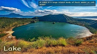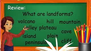 The document outlines different types of waterforms, providing definitions and examples such as bays, seas, rivers, and lakes. It includes activities for identifying images of these waterforms and an assessment section for further learning. Additionally, it references online resources for animated visuals related to waterforms.