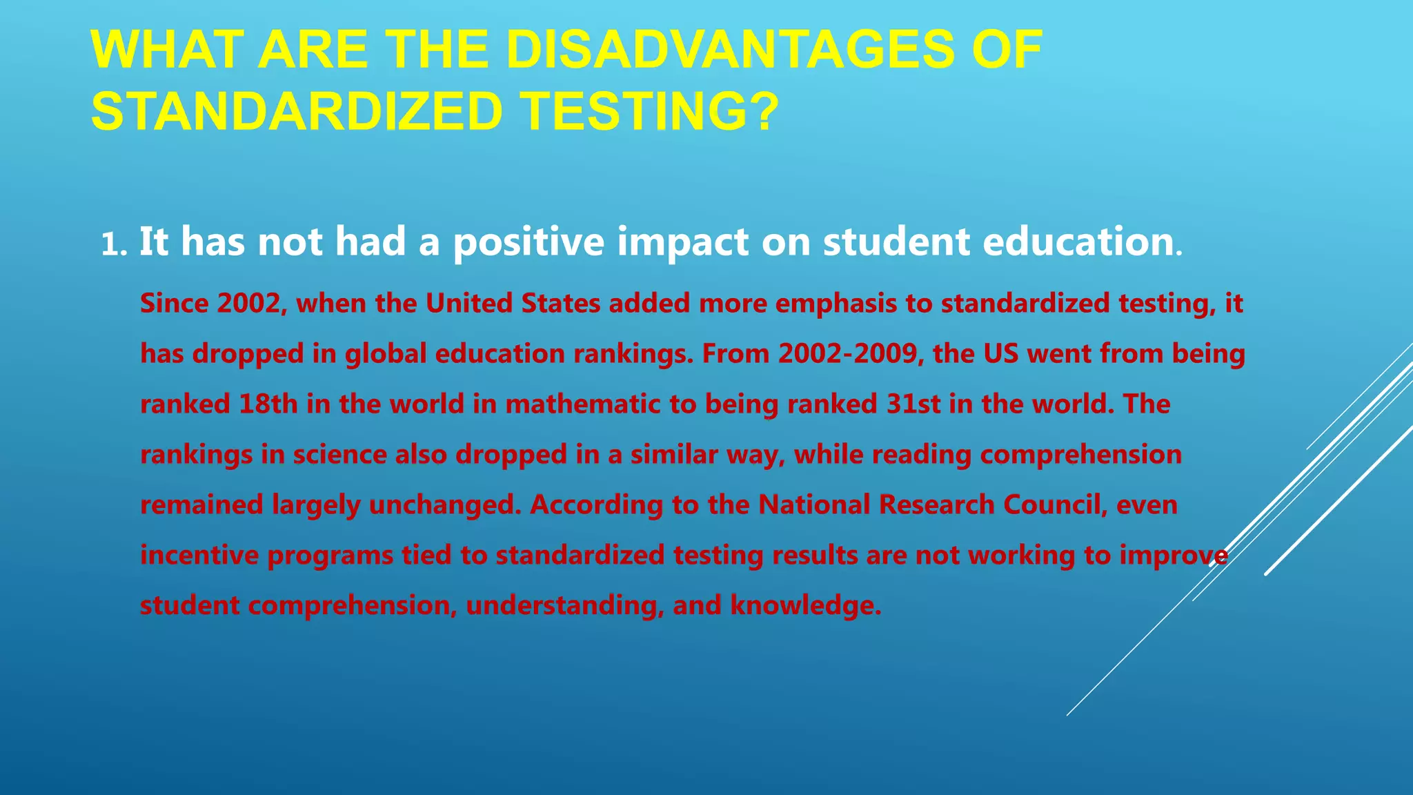 Farooq Iqbal presented on the disadvantages of standardized testing. Standardized testing has not improved student learning and has correlated with declines in US education rankings globally. It can also be predictable, assuming all students start from the same level of understanding and only measures raw comprehension data rather than other skills. Additionally, tying teacher evaluations to standardized test results has incentivized "teaching to the test" rather than comprehensive learning and has narrowed curriculums. More time is also spent on test preparation rather than actual learning. While standardized testing can be a useful evaluation tool, it needs to be implemented carefully to avoid potential issues.