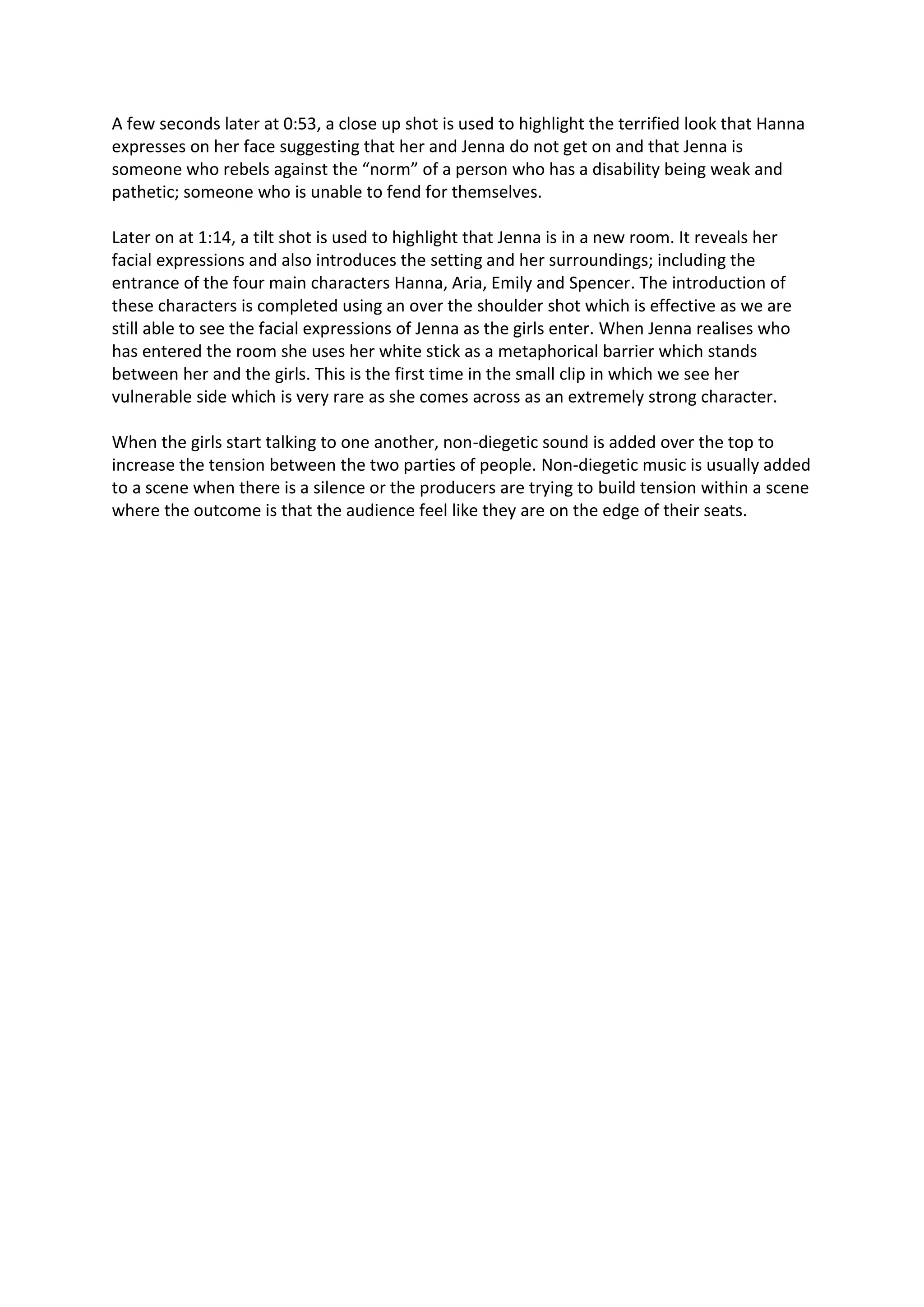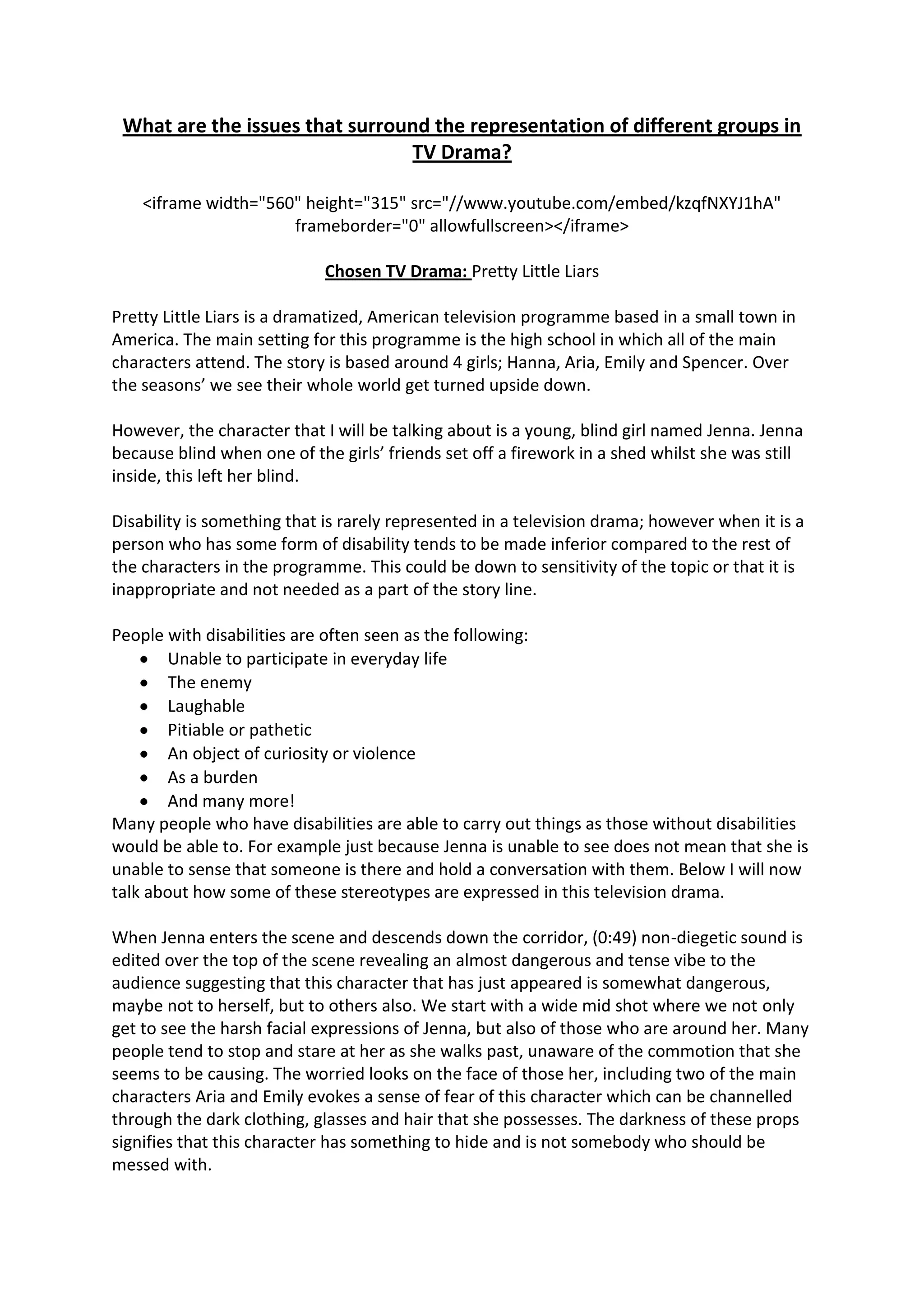 This document discusses the representation of disability in the TV drama Pretty Little Liars. It focuses on the character Jenna, who is blind. Stereotypes of disabled people often portray them as unable to participate normally, as burdens, or as objects of curiosity or violence. The analysis shows how Jenna is initially presented through camera techniques and music as a somewhat dangerous figure who causes fear, rebelling against stereotypes of disability making her weak. Later shots show her vulnerability as she uses her cane as a barrier between herself and the other characters. Non-diegetic music builds tension between Jenna and the other girls in the scene.