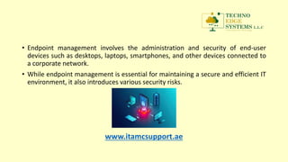 • Endpoint managementinvolves the administration and security of end-user devices such as desktops, laptops, smartphones, and other devices connected to a corporate network. • While endpoint management is essential for maintaining a secure and efficient IT environment, it also introduces various security risks. www.itamcsupport.ae