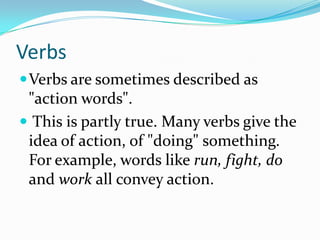 Verbs are words that describe actions or states of being and are essential to forming sentences. They can convey physical actions, like "run" or "fight", or states of being, like "be" or "seem". Verbs always have a subject and change form depending on tense, unlike other words. Verbs are classified as either helping verbs, such as "be", "have", and "do", which assist main verbs, or main verbs which convey meaning on their own like "teach" or "eat". Modal helping verbs further modify main verbs to express necessity or possibility.