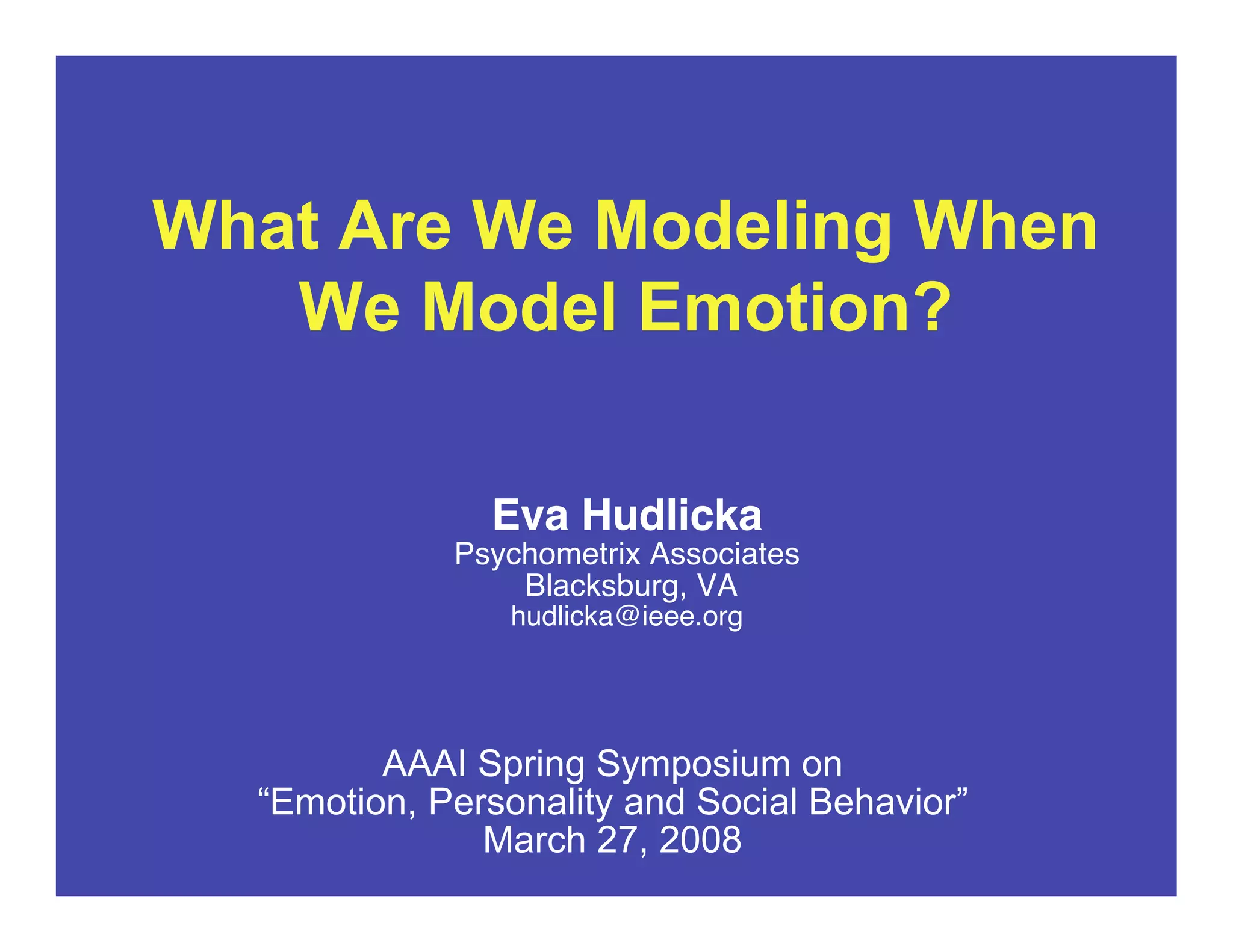 This document discusses the need for more clarity and guidelines when modeling emotion computationally. It proposes analyzing emotion models in terms of the two core processes of emotion generation and emotion effects. Key computational tasks for implementing these processes are identified, which could provide a basis for more systematically designing, comparing, and evaluating emotion models and theories. The roles of emotions, aspects modeled, and influential appraisal theories are reviewed. More information is needed to fully specify the computational implementation of appraisal dimensions, integration of multiple emotions, and variable influences on cognition and behavior.