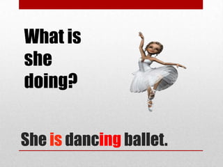 The document is a lesson about using the present continuous tense in English. It provides examples of affirmative and negative statements using "be + verb+ing" construction. Some examples include "She is dancing ballet", "Bart is skating", "They are riding bikes", "Paul is playing soccer". It also shows contractions like "I'm", "she's", "they're" and questions formed with "be" like "Is he cooking barbecue?". Overall, the document teaches how to form and use present continuous tense statements and questions in English through examples.