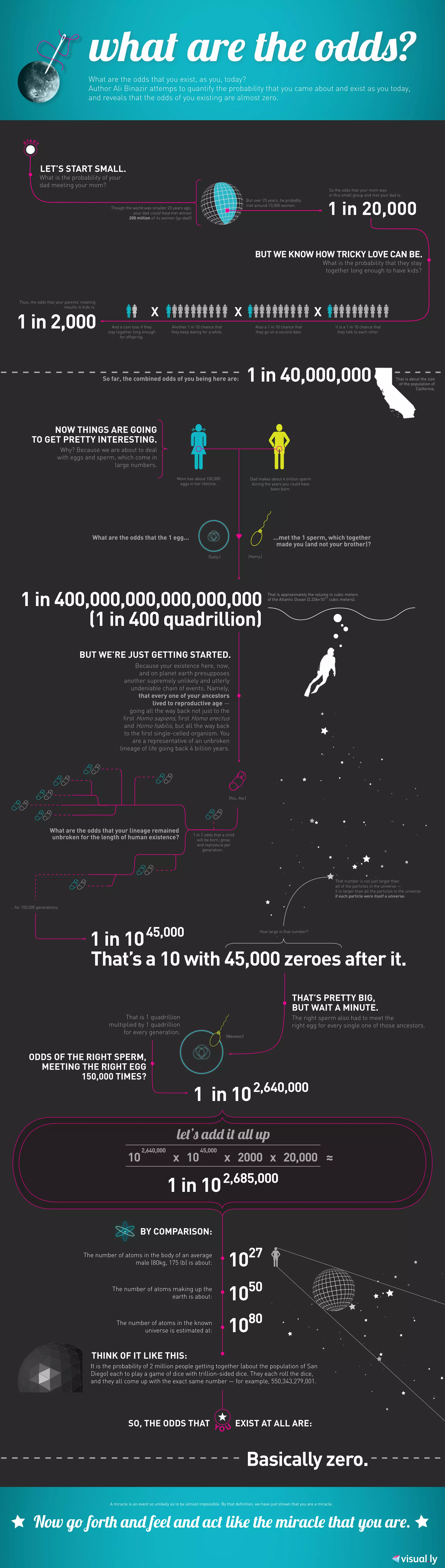 The document discusses the improbability of individual existence, calculating the odds of being born based on various factors such as parental meeting and lineage continuity. It concludes that the probability of your existence is extraordinarily low, emphasizing the miraculous nature of life. The overall odds are quantified as nearing 'almost zero', highlighting the complexity of ancestry and reproduction through an extensive numerical analysis.