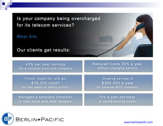 Berlin Pacific is an independent telecom expense management firm that claims it can reduce telecom costs by 50% without client work. It analyzes telecom bills to identify unused services, negotiate better contracts, and fix billing errors. Clients need only provide bill access and approve proposed changes. Berlin Pacific implements changes and bills clients only after documenting savings from reduced telecom bills. There is no upfront cost for clients, who keep most of the recurring savings.