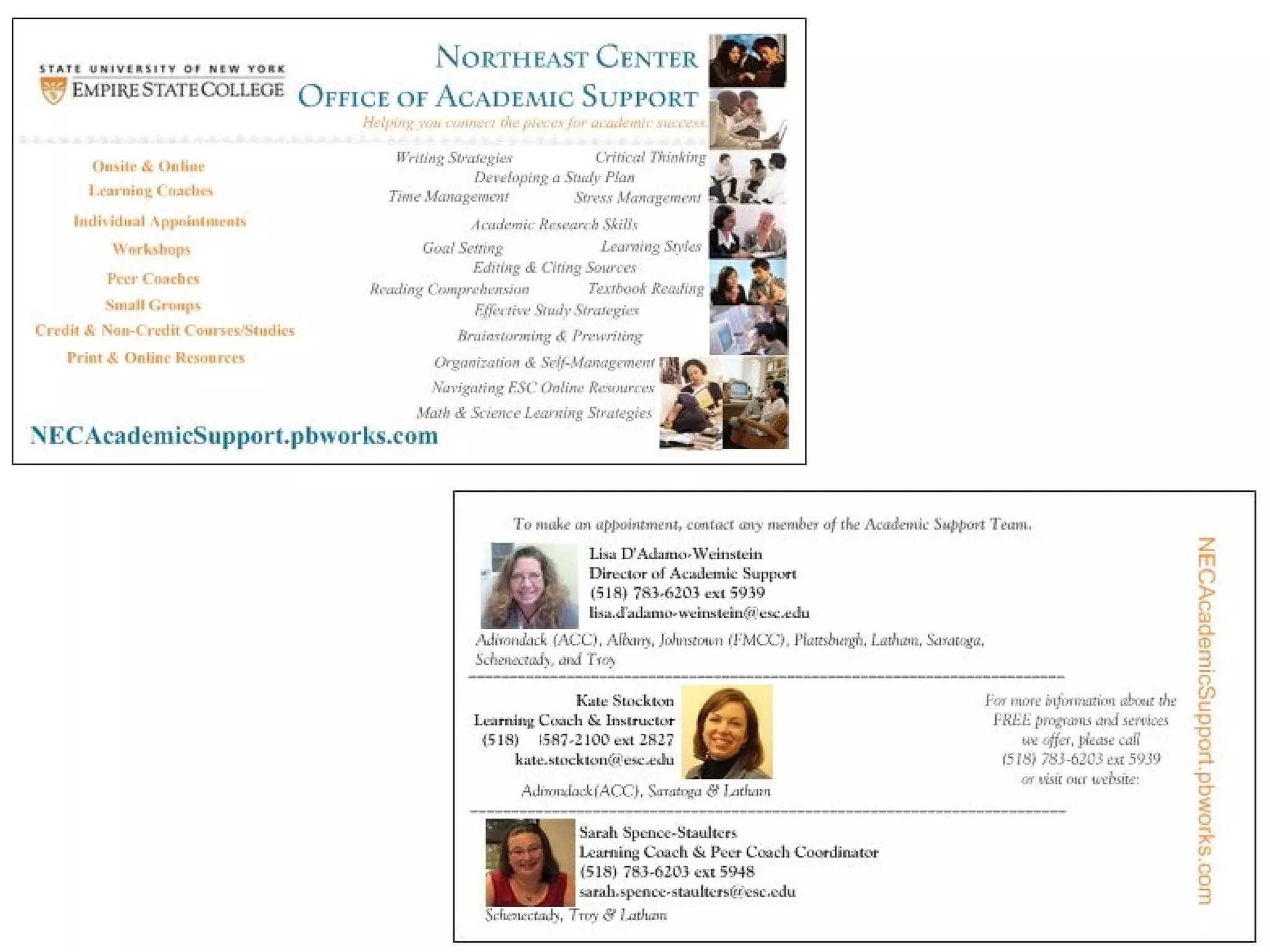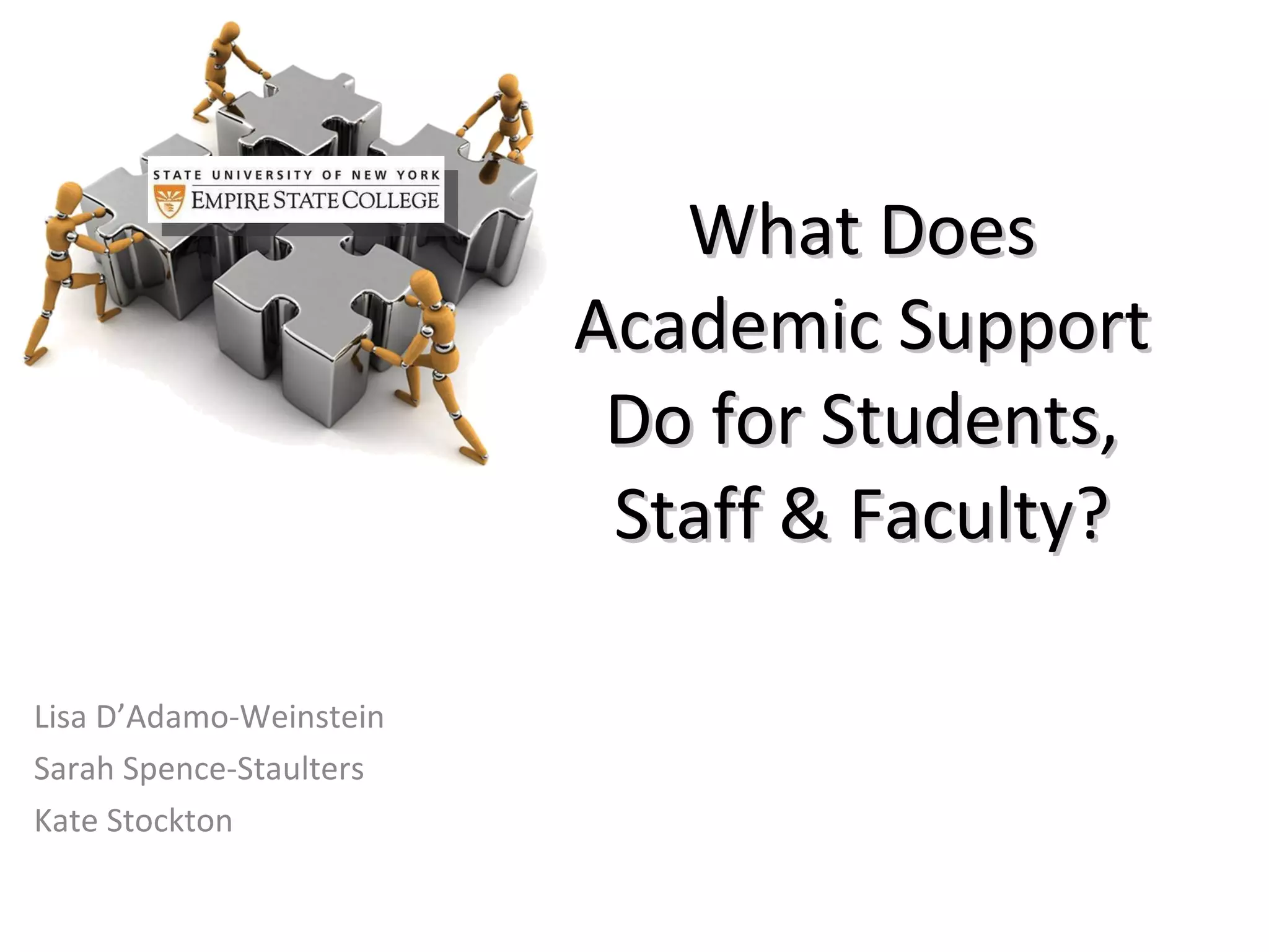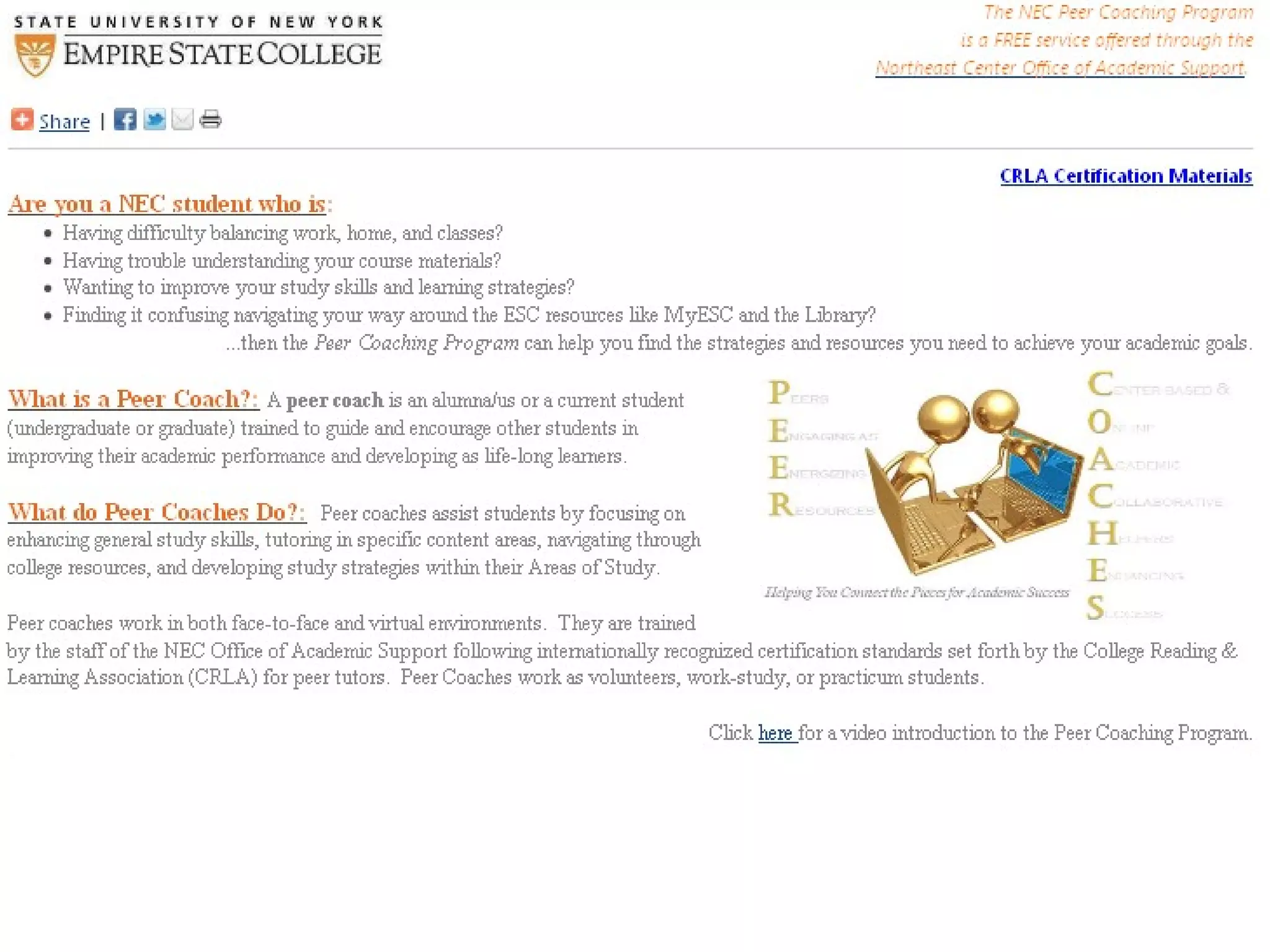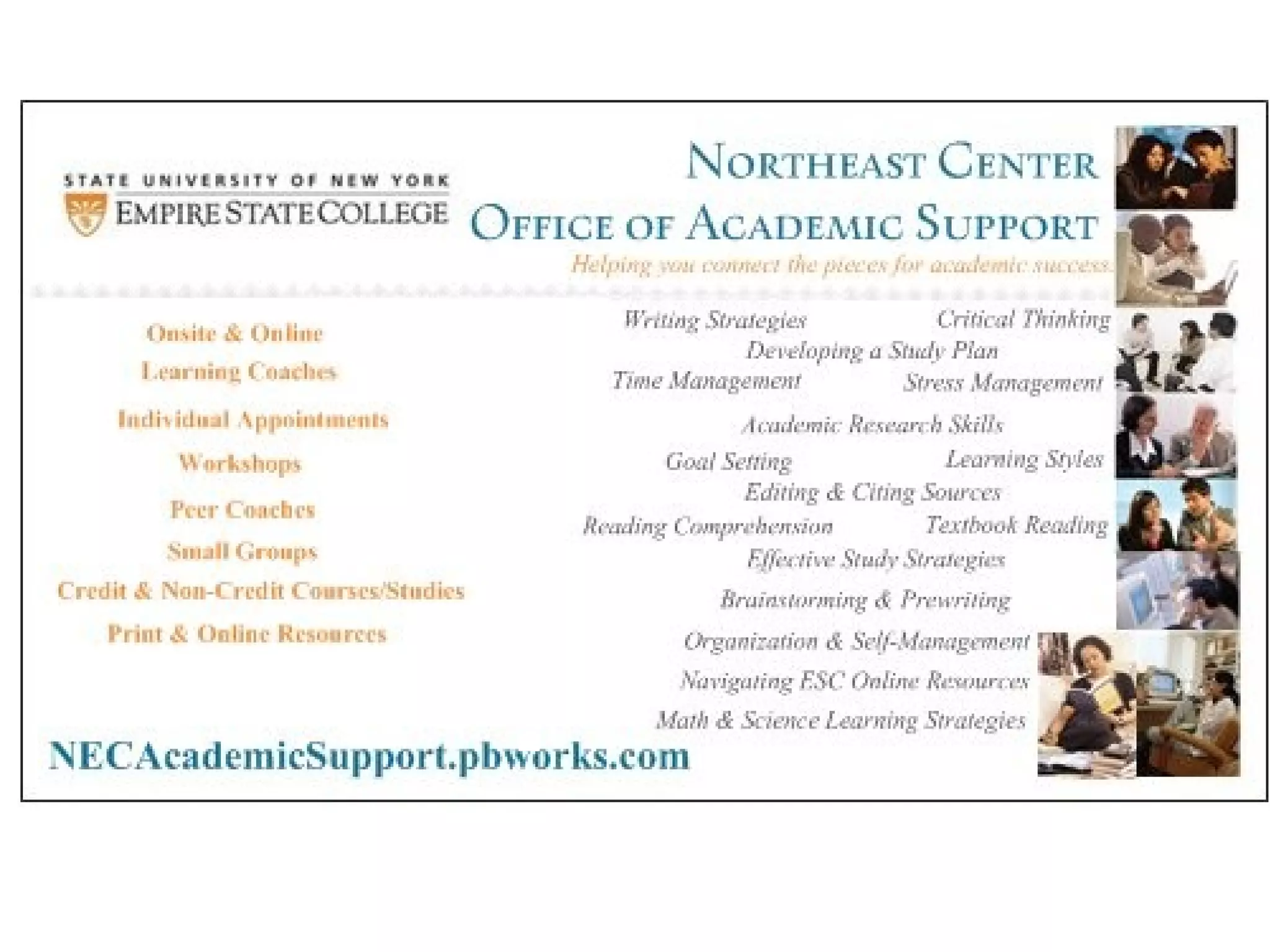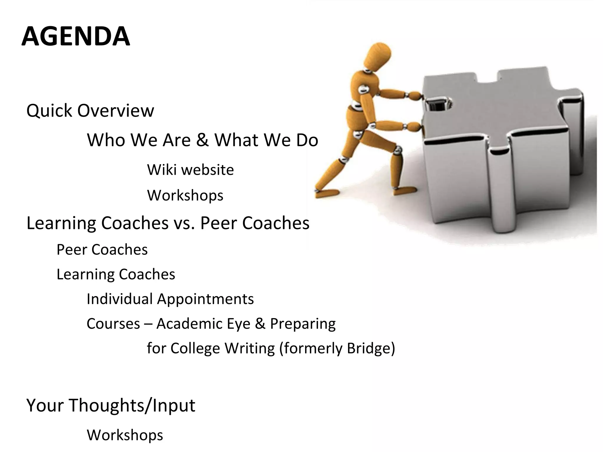 The document provides an overview of the academic support services available to students, staff, and faculty at Northeast Center. It summarizes the roles of learning coaches and peer coaches who provide individual appointments, workshops, and courses to help students improve their study skills and academic performance. Peer coaches are trained students who assist with content tutoring, while learning coaches are graduates who conduct workshops and courses, train peer coaches, and provide direct academic support. The document also lists resources on the academic support wiki website, YouTube channel, and Smarthinking online tutoring service. It concludes by soliciting input on future workshop schedules and uses of peer coaches.