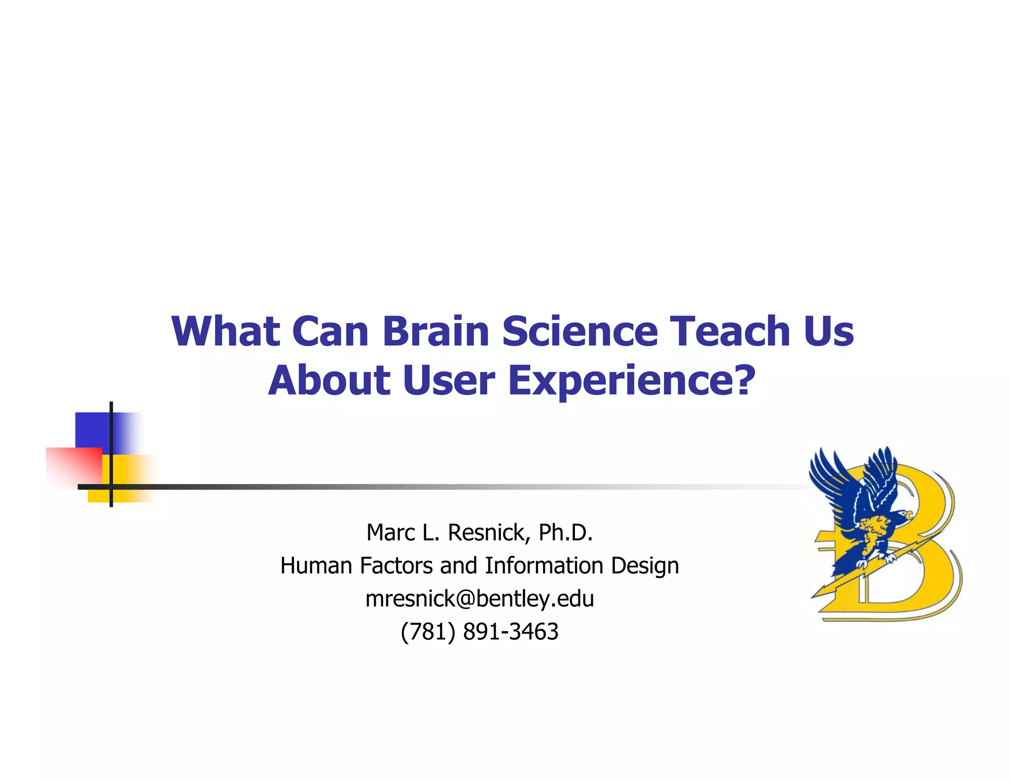 The document discusses how brain science can inform user experience design, emphasizing the influence of instant gratification, decision-making processes, and the impact of aging on user preferences. It highlights the importance of understanding neural systems governing immediate versus long-term decisions and suggests design strategies, such as using smart defaults and visuals, to enhance user experience. Additionally, it addresses the varying needs of younger and older users, advocating for tailored design approaches to accommodate different cognitive processes.