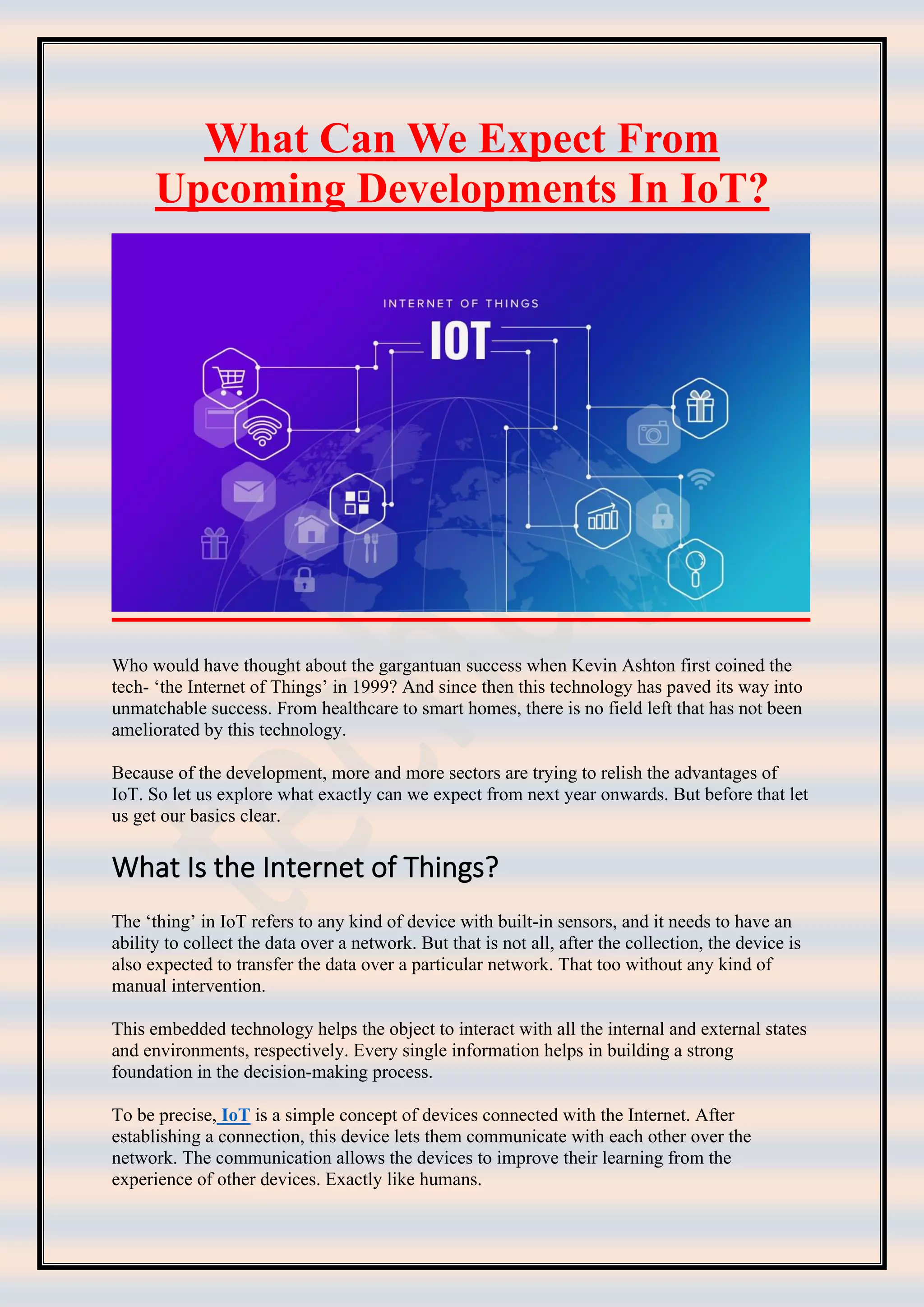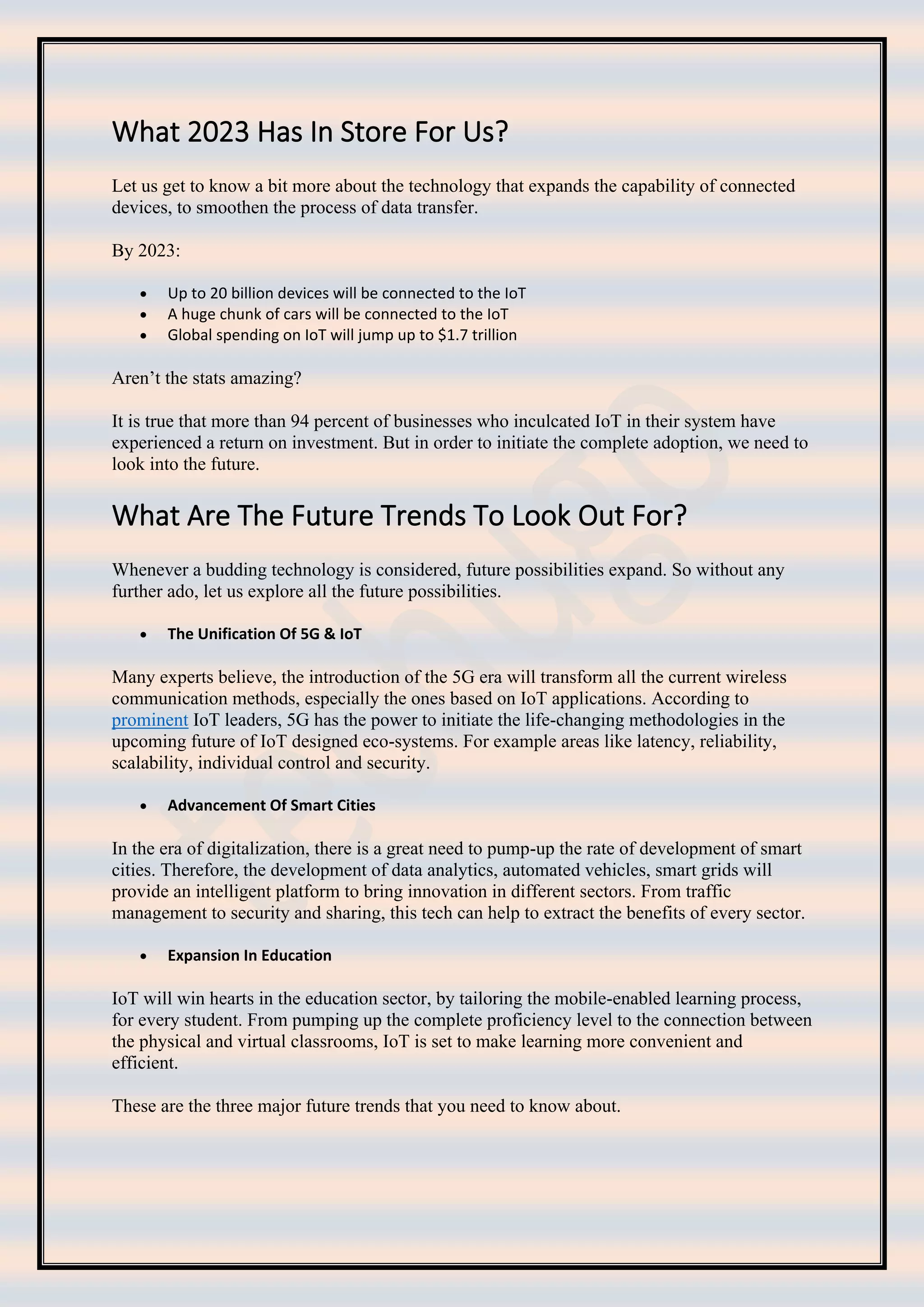The document discusses the expected developments in the Internet of Things (IoT), highlighting its vast impact across various sectors since its inception. Predictions for 2023 include the connection of up to 20 billion devices, with significant spending in the sector projected at $1.7 trillion, while outlining trends such as the unification of 5G with IoT, advancements in smart cities, and expansion in education. Challenges like interoperability, encryption issues, and internet reliability are also noted as hurdles for further development.