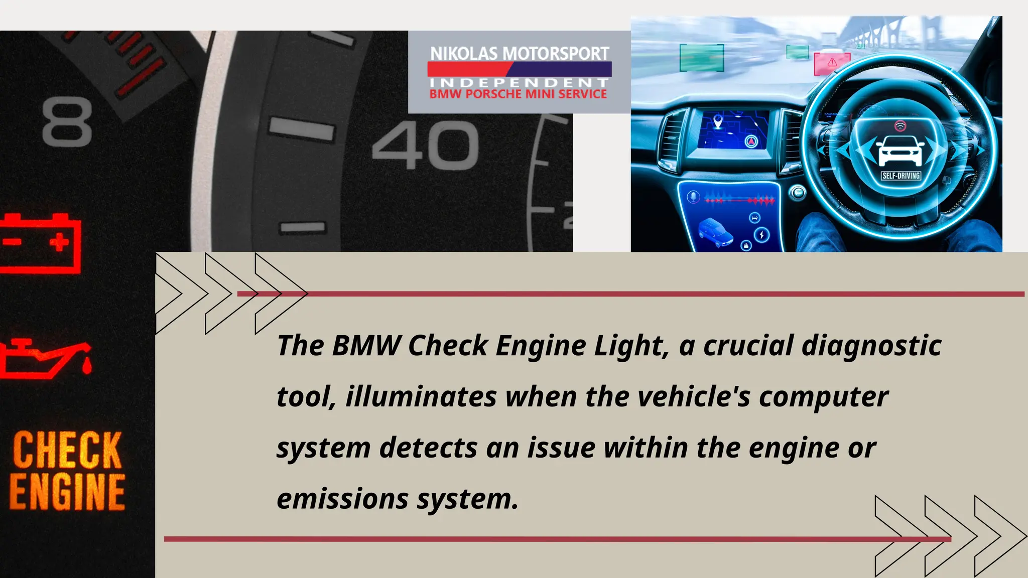 The BMW check engine light illuminates when the vehicle's computer detects engine or emissions system issues, requiring immediate attention to prevent damage and maintain performance. Common causes include sensor malfunctions, emission system problems, ignition system issues, fuel system problems, vacuum leaks, electrical issues, and low-quality fuel. Prompt diagnosis by a qualified technician is recommended when the check engine light comes on.
