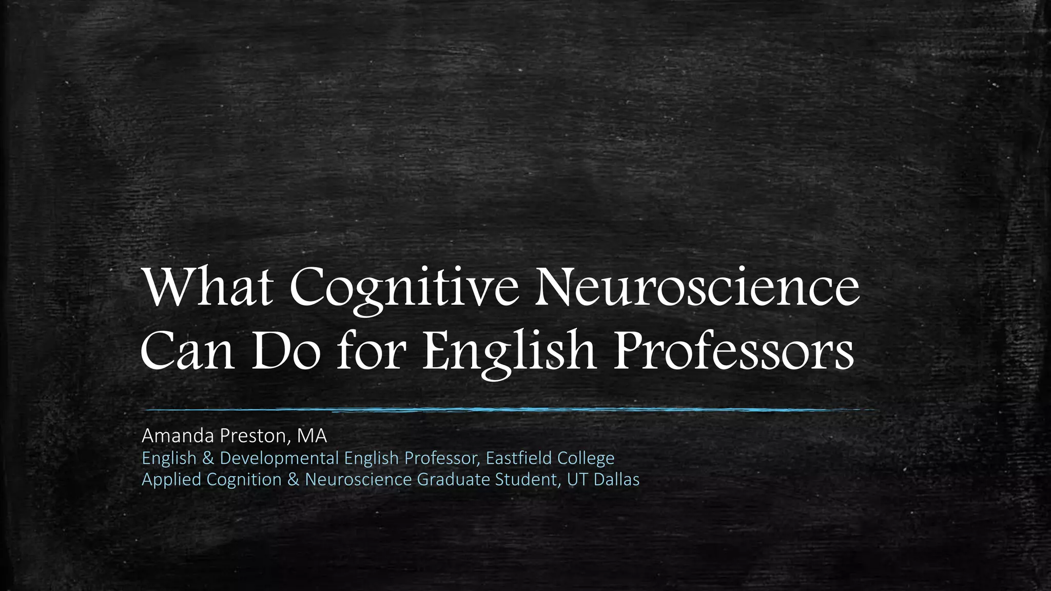 The document discusses the applications of cognitive neuroscience for English professors, focusing on language processing in the brain, memory, and teaching strategies. It includes various thought experiments designed to illustrate these concepts and how they can be implemented in the classroom to enhance learning. Additionally, it emphasizes the importance of staying informed about neuroscience research to improve teaching methodologies and student outcomes.