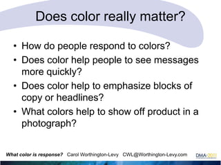 The document discusses how color can impact response and sales. It provides examples of companies that improved sales by changing colors on their websites and marketing materials from dark to lighter, warmer tones. The document also discusses how different colors convey different meanings and emotions, and how color choice is important for legibility, branding, and attracting versus annoying viewers. It emphasizes that high contrast between text and background improves readability, and that color symbolism should match the product or service being promoted.