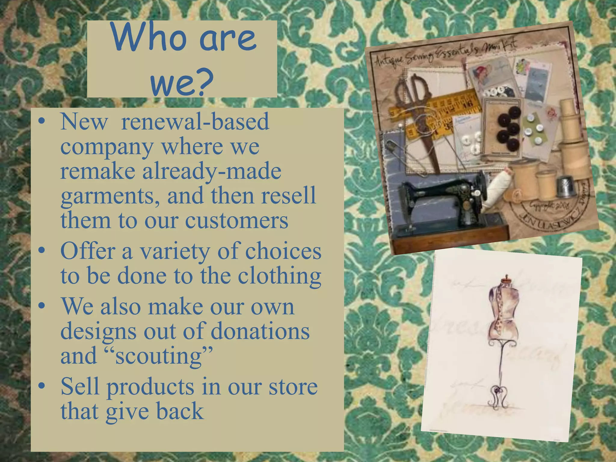 Our company remakes pre-owned garments and textiles and resells them. We are located in downtown Denton, Texas in a refurbished building. Our mission is to provide an eco-friendly and affordable service to help customers create unique pieces for their wardrobe while reducing waste. We attract budget-conscious and environmentally-minded college students. Services include redesigning clothes, curtains, and other fabrics into new fashion pieces. We aim to reduce our carbon footprint through practices like recycling, using LED lights, and concrete floors. We offer customer loyalty points and recycled shopping bags made from donated fabrics.