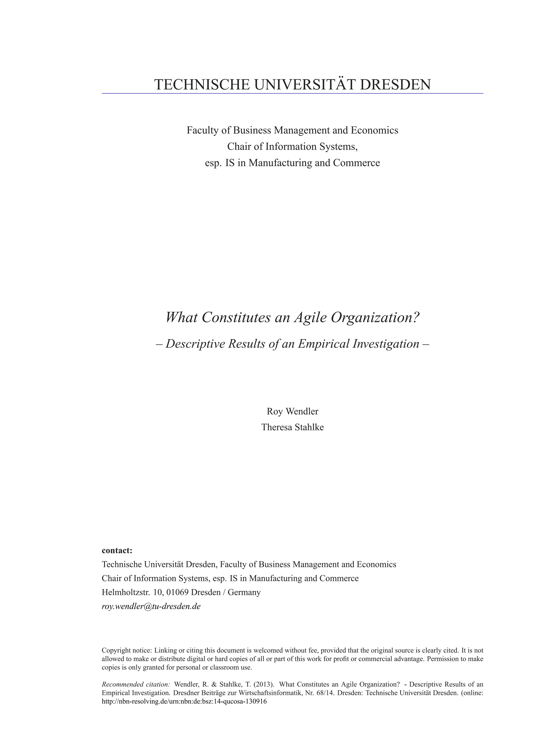 The document presents an empirical investigation into what constitutes an agile organization, capturing various aspects such as values, conditions, capabilities, and activities that define agility. It details insights drawn from participants across different roles, sizes, locations, and customer types, aiming to delineate characteristics that foster agile practices in organizations. The findings contribute to a better understanding of agility in the context of business management and inform further research in the field.