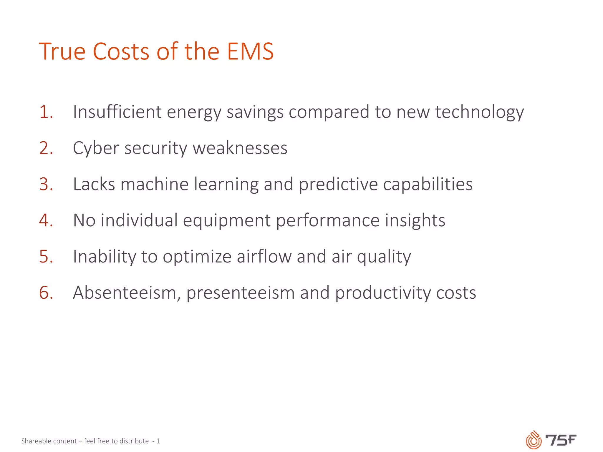 An energy management system (EMS) provides insufficient energy savings compared to new predictive technologies, has cybersecurity weaknesses, and lacks machine learning capabilities. It fails to provide insights into individual equipment performance or optimize airflow and air quality. In contrast, a predictive system can achieve 30-70% greater energy savings through use of cloud computing, machine learning, and hundreds of IoT data points per minute to optimize efficiency, security, and indoor air quality in a proactive manner. This results in improved cognitive performance and an estimated 8% gain in worker productivity.