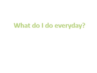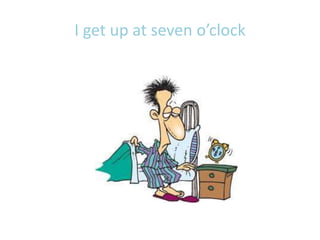 This document outlines a typical daily routine, beginning with waking up at 7am, getting dressed, and having breakfast at 8am. The person then brushes their teeth, goes to school from 8:30am to 3pm, comes home, eats at 3:30pm, does homework at 4pm, watches TV at 5:30pm, listens to music, and plays games on their phone at 6pm. They shower, dry their hair, and prepare their bag at 7pm, have dinner at 8pm, read at 9pm, brush their teeth, and go to bed at 10pm.