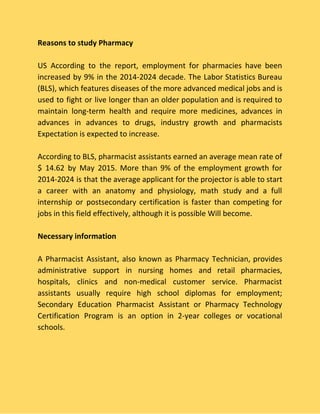 The document outlines the pathways to becoming a pharmacy technician, emphasizing that a high school diploma and job training can initiate a career as a pharmacy assistant. It highlights the importance of post-secondary certification programs and statistics pointing to a 9% employment increase for pharmacists from 2014 to 2024. Roles of pharmacy assistants include administrative support in various healthcare settings, with educational requirements often including mathematics, anatomy, and customer service skills.