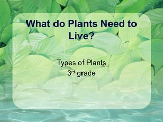 Plants need four things to live: water, nutrients, light, and soil. Water is absorbed by roots and transported throughout the plant. Nutrients are absorbed from the soil through roots. Leaves use light energy and carbon dioxide to produce food through photosynthesis. Soil provides anchoring and a source of water and nutrients for roots.