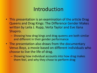 This document summarizes an article and documentary about drag kings and drag queens. It finds that while drag kings and queens both challenge rigid gender norms, they differ in their approaches and experiences. Drag kings portrayed in the documentary explore masculinity through performance to experience freedom from female roles, while drag queens announce their identities as gay men to undermine divides between sexuality. Both use performance as a form of education to critique social standards of gender and sexuality.