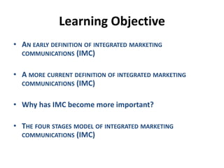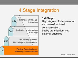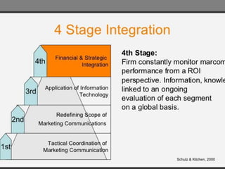 The document discusses the evolution and definitions of Integrated Marketing Communications (IMC), highlighting its significance in contemporary marketing strategies that go beyond traditional advertising. It outlines a four-stage model of IMC development, from early tactical coordination to advanced financial and strategic integration, emphasizing the need for a synergistic approach in utilizing various communication tools. Additionally, the document addresses the importance of data-driven insights and understanding diverse audience segments in crafting effective marketing communications.