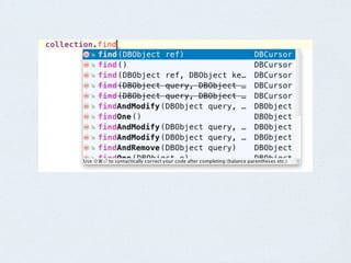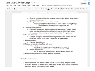 The document discusses the development and features of a MongoDB Java driver, highlighting the importance of backwards compatibility, separation of concerns, and usability improvements. It covers various programming aspects such as API usability, testing challenges, and the integration of new technologies like Java 8 features. The presentation emphasizes best practices for documentation, code maintenance, and testing strategies while encouraging developers to engage with the new driver.