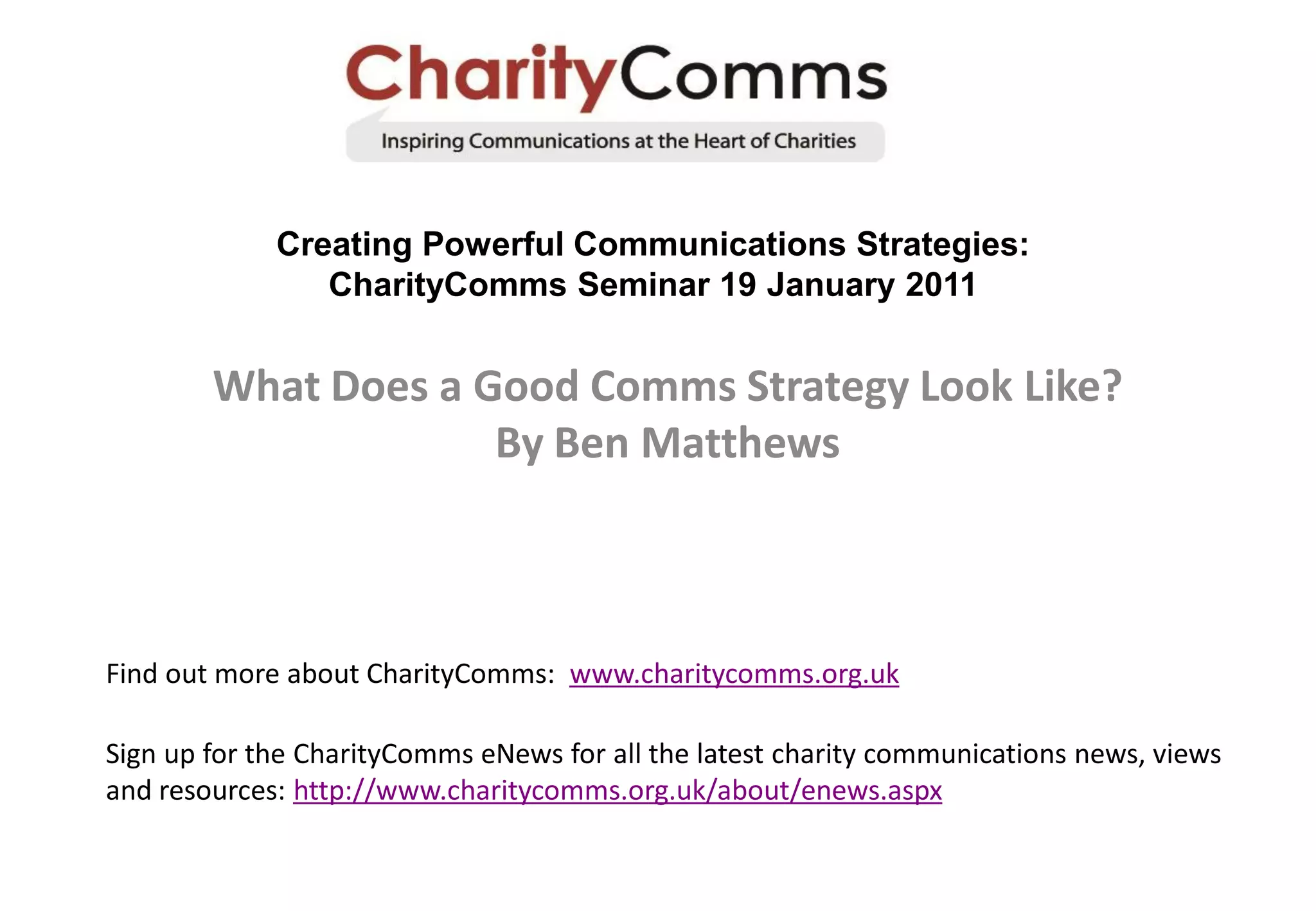 Creating Powerful Communications Strategies was a seminar held by CharityComms on January 19, 2011. The seminar provided guidance on developing an effective communications strategy, including answering six key questions: what resources are available, what the goals are, who the target audience is, who the broader audience is, how to frame the issue, and what the core message should be. Attendees learned about crafting messages that resonate with audiences and media, choosing appropriate tactics like events and social media, creating a timeline and evaluation plan, and celebrating successes. The seminar aimed to help charities strengthen their communications efforts.