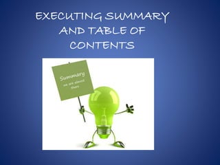 A marketing plan includes an executive summary that outlines the key points of the plan and a table of contents to help navigate the document. It also contains financial projections to estimate revenue, costs, and profit over a set period of time.