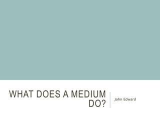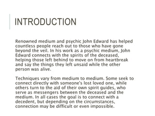 John Edward is a renowned psychic medium who helps individuals connect with the spirits of deceased loved ones to provide closure. Mediums vary in their techniques, with some directly connecting to spirits and others using spirit guides, but not all psychic readers have this capability. Interested individuals can seek out a medium through professionals, spiritual churches, or telephone consultations.