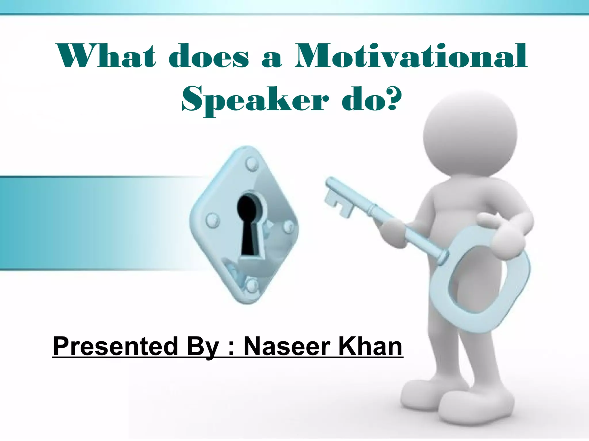 A motivational speaker, such as Naseer Khan, delivers inspiring speeches aimed at motivating audiences to achieve personal and professional changes. Good speakers possess clarity, relevance, and enthusiasm while addressing topics in personal development, business, youth mentorship, and community issues. Their goal is to encourage individuals to recognize their talents and take positive action in their lives.