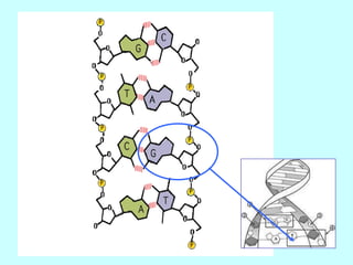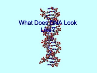 DNA contains the genetic code for building and maintaining organisms. It is made up of nucleotides that pair together in a double helix structure. Rosalind Franklin discovered through X-ray diffraction that DNA has a spiral shape, which Watson and Crick used to build a double helix model showing that DNA is made of two strands of alternating sugar-phosphate units connected by complementary nucleotide base pairs. DNA replicates through splitting and using each strand as a template to form two new double helices.