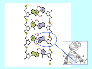 DNA contains the genetic code for building and maintaining organisms. It is made up of nucleotides that pair together in a double helix structure, with adenine pairing with thymine and guanine pairing with cytosine. Erwin Chargaff discovered these base pairing rules, and Rosalind Franklin used X-ray diffraction to show DNA has a spiral structure. This allowed James Watson and Francis Crick to build a molecular model showing DNA as a twisted ladder with nucleotides forming rungs between the sides. DNA replicates through this base pairing, with each side of the double helix serving as a template to form a new complementary strand.